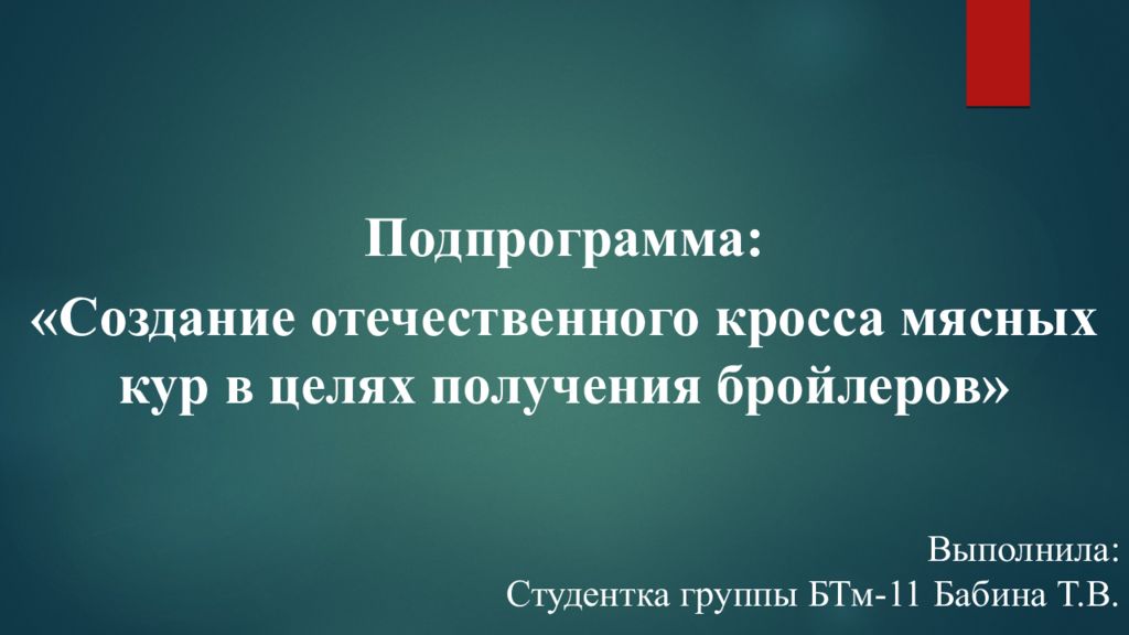 Подпрограмма: «Создание отечественного кросса мясных кур в целях получения бройлеров» Выполнила: Студентка группы БТм-11 Бабина Т.В.