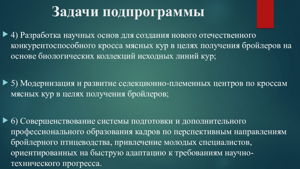 4) Р азработка научных основ для создания нового отечественного конкурентоспособного кросса мясных кур в целях получения бройлеров на основе биологических коллекций исходных линий кур; 5) М одернизация и развитие селекционно -племенных центров по кроссам мясных кур в целях получения бройлеров ; 6) Совершенствование системы подготовки и дополнительного профессионального образования кадров по перспективным направлениям бройлерного птицеводства, привлечение молодых специалистов, ориентированных на быструю адаптацию к требованиям научно-технического прогресса.