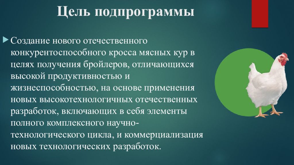 С оздание нового отечественного конкурентоспособного кросса мясных кур в целях получения бройлеров, отличающихся высокой продуктивностью и жизнеспособностью, на основе применения новых высокотехнологичных отечественных разработок, включающих в себя элементы полного комплексного научно-технологического цикла, и коммерциализация новых технологических разработок.
