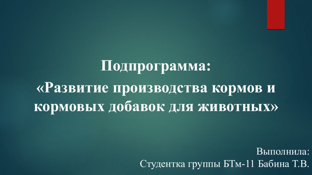 Подпрограмма: «Развитие производства кормов и кормовых добавок для животных» Выполнила: Студентка группы БТм-11 Бабина Т.В.