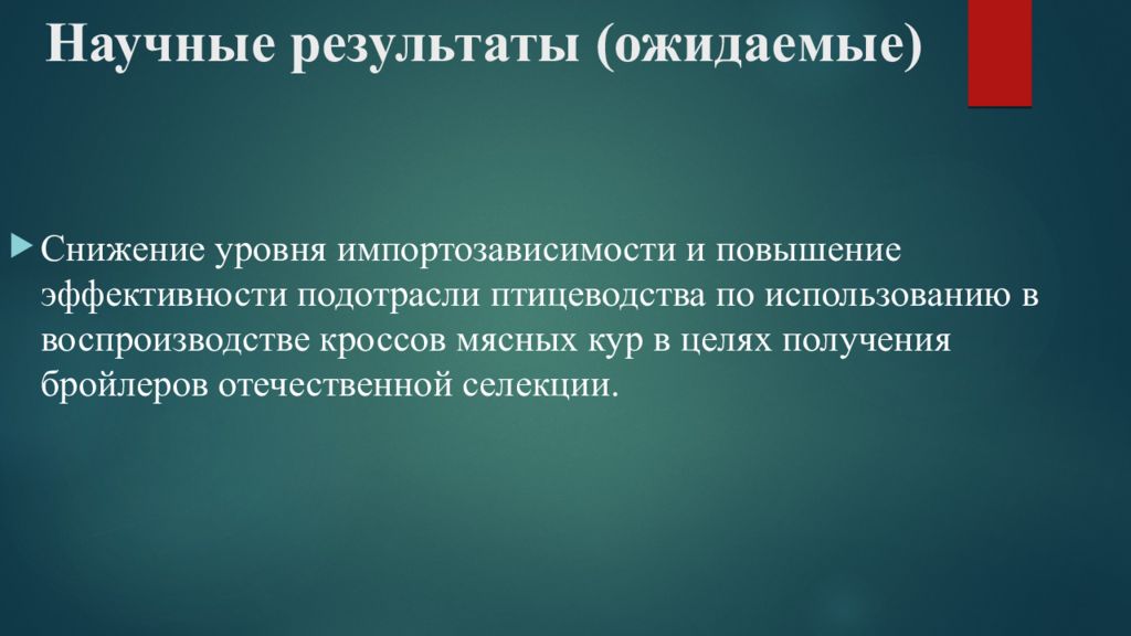 Снижение уровня импортозависимости и повышение эффективности подотрасли птицеводства по использованию в воспроизводстве кроссов мясных кур в целях получения бройлеров отечественной селекции.