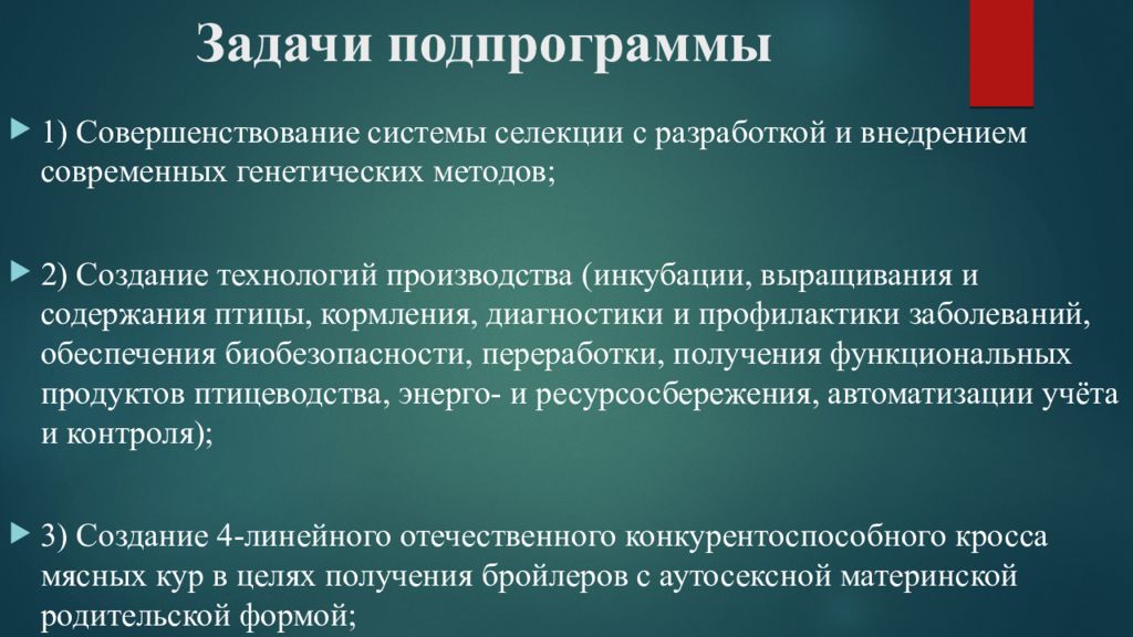 1) Совершенствование системы селекции с разработкой и внедрением современных генетических методов; 2) Создание технологий производства (инкубации, выращивания и содержания птицы, кормления, диагностики и профилактики заболеваний, обеспечения биобезопасности, переработки, получения функциональных продуктов птицеводства, энерго - и ресурсосбережения, автоматизации учёта и контроля ); 3) С оздание 4-линейного отечественного конкурентоспособного кросса мясных кур в целях получения бройлеров с аутосексной материнской родительской формой ;