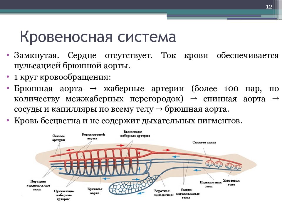 Замкнутая. Сердце отсутствует. Ток крови обеспечивается пульсацией брюшной аорты. 1 круг кровообращения: Брюшная аорта → жаберные артерии (более 100 пар, по количеству межжаберных перегородок) → спинная аорта → сосуды и капилляры по всему телу → брюшная аорта. Кровь бесцветна и не содержит дыхательных пигментов. 12