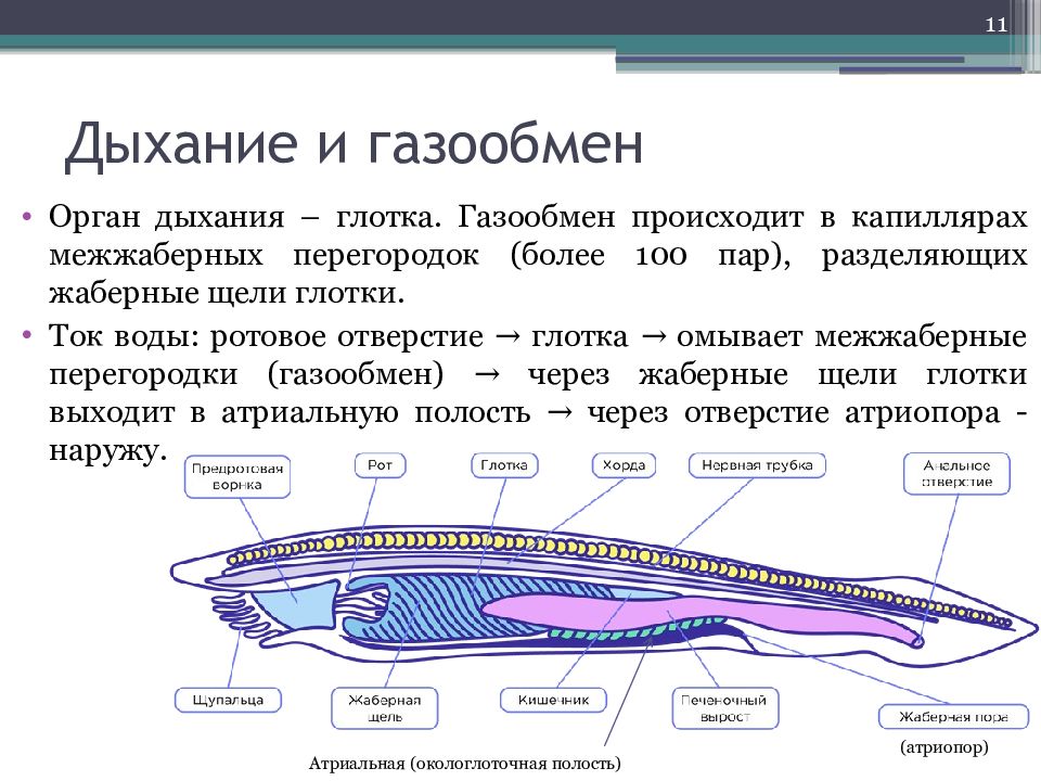 Орган дыхания – глотка. Газообмен происходит в капиллярах межжаберных перегородок (более 100 пар), разделяющих жаберные щели глотки. Ток воды: ротовое отверстие → глотка → омывает межжаберные перегородки (газообмен) → через жаберные щели глотки выходит в атриальную полость → через отверстие атриопора - наружу. 11 ( атриопор ) Атриальная (окологлоточная полость)