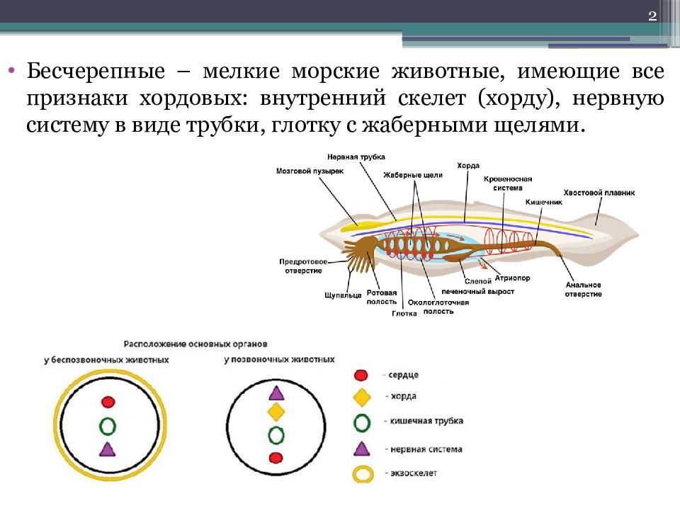 Бесчерепные – мелкие морские животные, имеющие все признаки хордовых: внутренний скелет ( хорду), нервную систему в виде трубки, глотку с жаберными щелями. 2