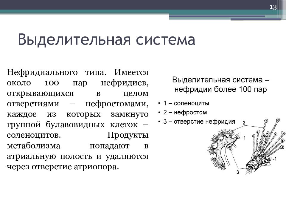Нефридиального типа. Имеется около 100 пар нефридиев, открывающихся в целом отверстиями – нефростомами, каждое из которых замкнуто группой булавовидных клеток – соленоцитов. Продукты метаболизма попадают в атриальную полость и удаляются через отверстие атриопора. 13