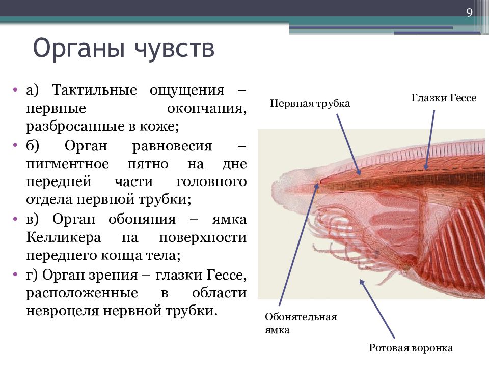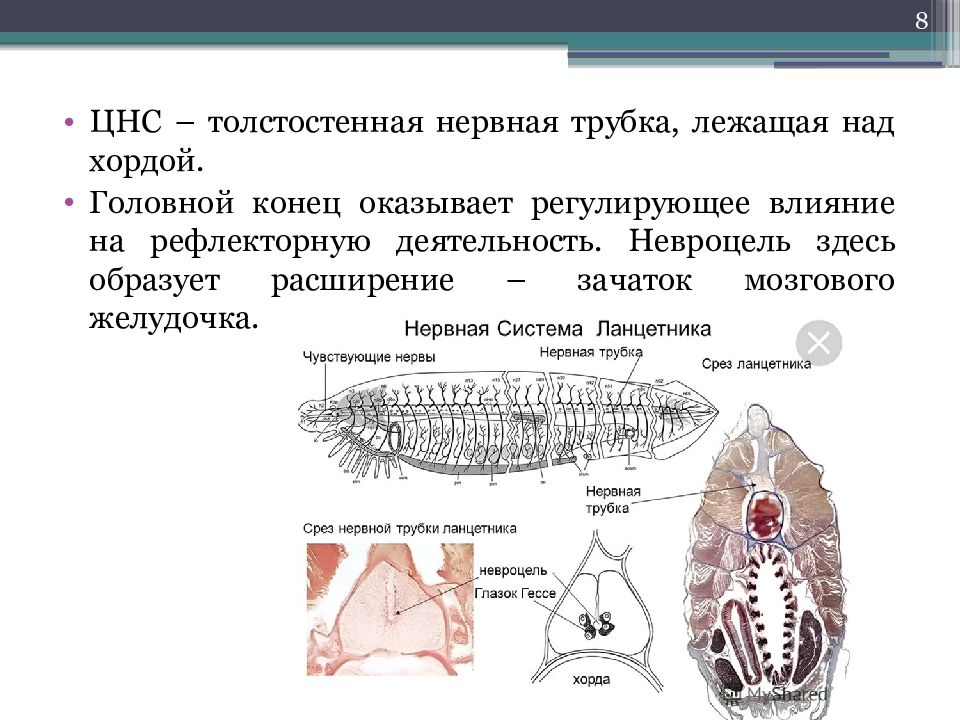 ЦНС – толстостенная нервная трубка, лежащая над хордой. Г оловной конец оказывает регулирующее влияние на рефлекторную деятельность. Невроцель здесь образует расширение – зачаток мозгового желудочка. 8
