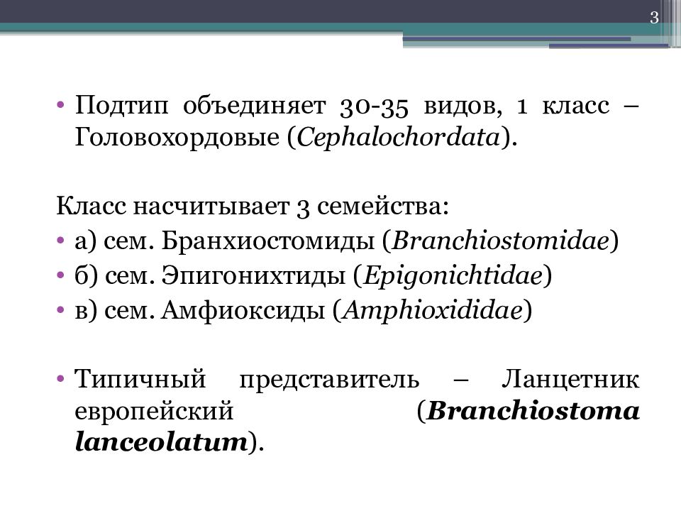 Подтип объединяет 30-35 видов, 1 класс – Головохордовые ( Cephalochordata ). Класс насчитывает 3 семейства: а) сем. Бранхиостомиды ( Branchiostomidae ) б ) сем. Эпигонихтиды ( Epigonichtidae ) в ) сем. Амфиоксиды ( Amphioxididae ) Типичный представитель – Ланцетник европейский ( Branchiostoma lanceolatum ). 3