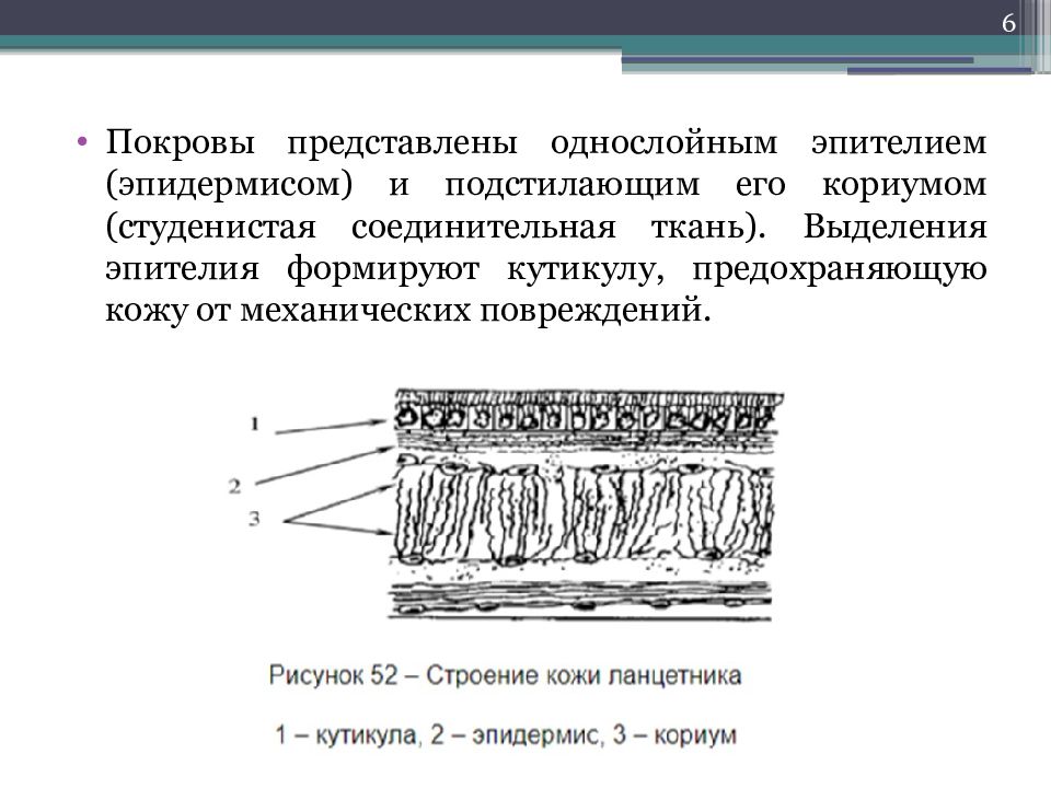 Покровы представлены однослойным эпителием (эпидермисом) и подстилающим его кориумом (студенистая соединительная ткань). Выделения эпителия формируют кутикулу, предохраняющую кожу от механических повреждений. 6