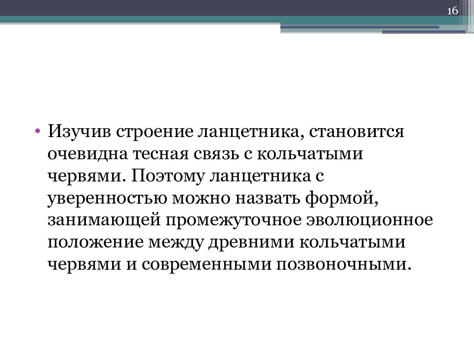 Изучив строение ланцетника, становится очевидна тесная связь с кольчатыми червями. Поэтому ланцетника с уверенностью можно назвать формой, занимающей промежуточное эволюционное положение между древними кольчатыми червями и современными позвоночными. 16