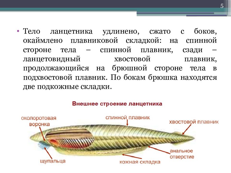 Тело ланцетника удлинено, сжато с боков, окаймлено плавниковой складкой: на спинной стороне тела – спинной плавник, сзади – ланцетовидный хвостовой плавник, продолжающийся на брюшной стороне тела в подхвостовой плавник. По бокам брюшка находятся две подкожные складки. 5