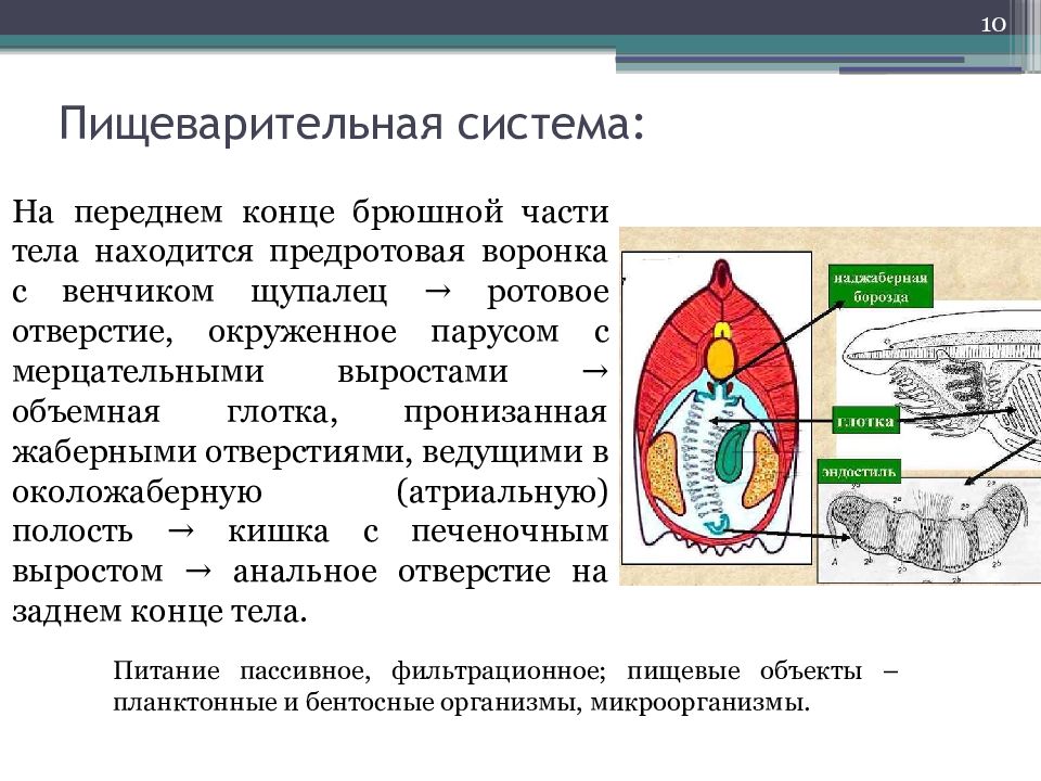 На переднем конце брюшной части тела находится предротовая воронка с венчиком щупалец → ротовое отверстие, окруженное парусом с мерцательными выростами → объемная глотка, пронизанная жаберными отверстиями, ведущими в околожаберную ( атриальную ) полость → кишка с печеночным выростом → анальное отверстие на заднем конце тела. 10 Питание пассивное, фильтрационное; пищевые объекты – планктонные и бентосные организмы, микроорганизмы.
