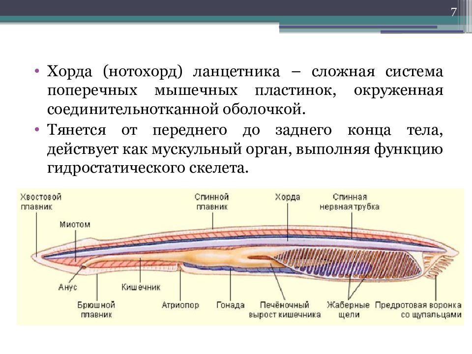 Хорда ( нотохорд ) ланцетника – сложная система поперечных мышечных пластинок, окруженная соединительнотканной оболочкой. Тянется от переднего до заднего конца тела, действует как мускульный орган, выполняя функцию гидростатического скелета. 7