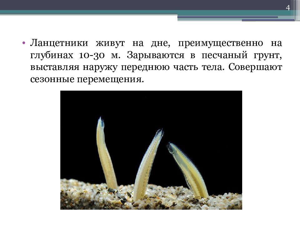 Ланцетники живут на дне, преимущественно на глубинах 10-30 м. Зарываются в песчаный грунт, выставляя наружу переднюю часть тела. Совершают сезонные перемещения. 4