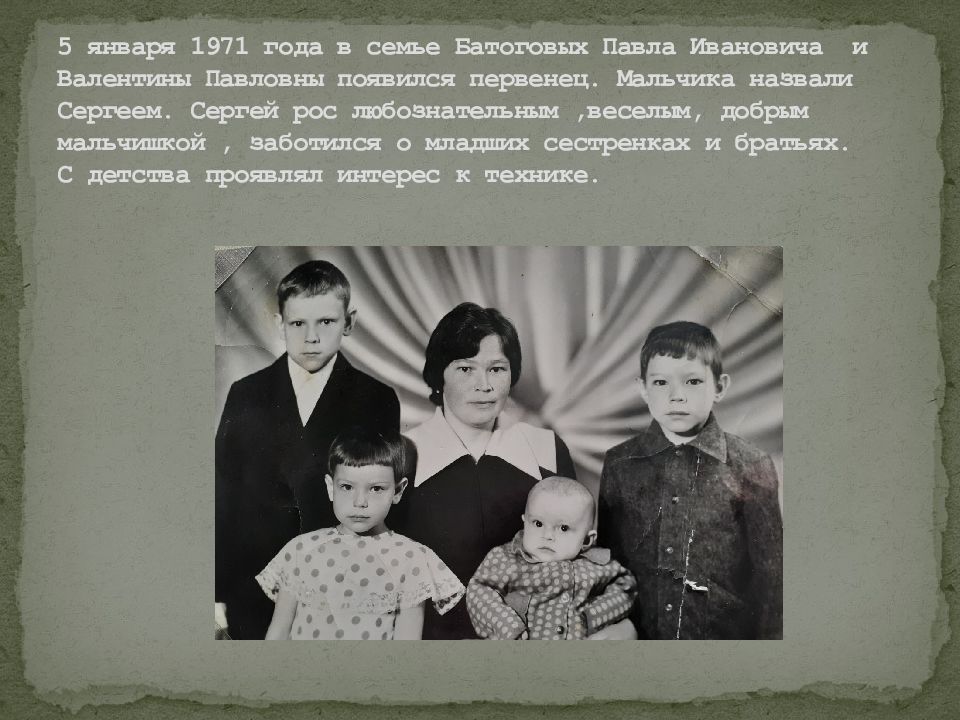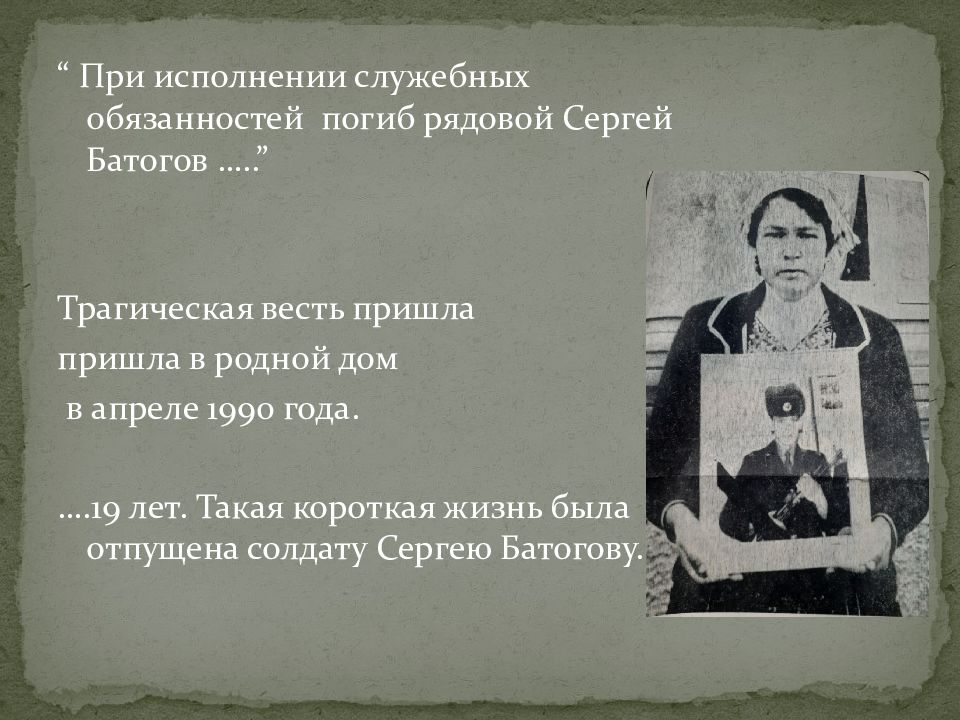 “ П ри исполнении служебных обязанностей погиб рядовой Сергей Батогов ….. ” Трагическая весть пришла п ришла в родной дом в апреле 1990 года. ….19 лет. Такая короткая жизнь была отпущена солдату Сергею Батогову.