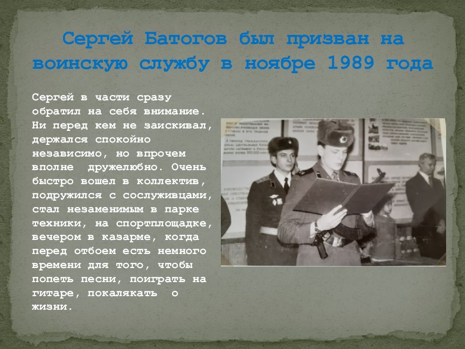 Сергей в части сразу обратил на себя внимание. Ни перед кем не заискивал, держался спокойно независимо, но впрочем вполне дружелюбно. Очень быстро вошел в коллектив, подружился с сослуживцами, стал незаменимым в парке техники, на спортплощадке, вечером в казарме, когда перед отбоем есть немного времени для того, чтобы попеть песни, поиграть на гитаре, покалякать о жизни.