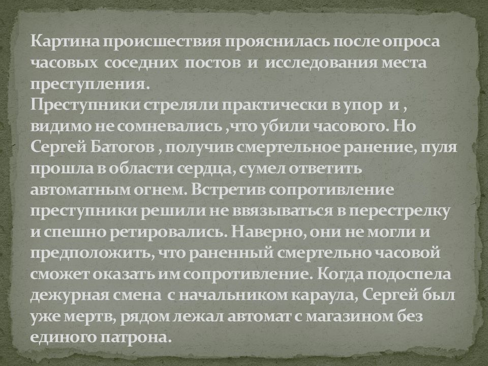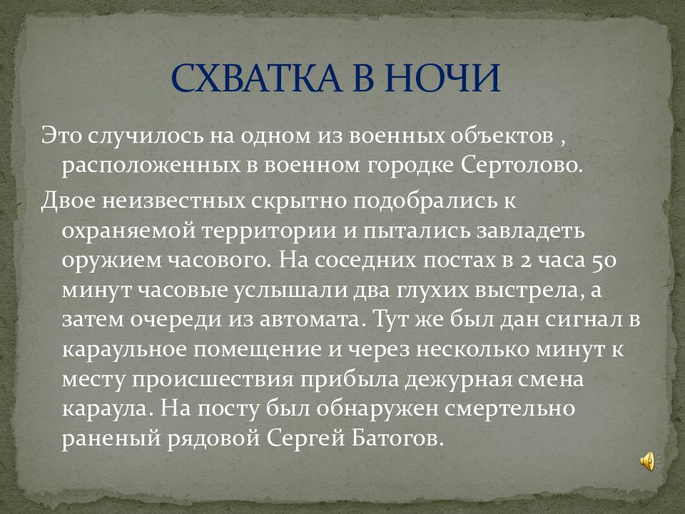 Это случилось на одном из военных объектов, расположенных в военном городке Сертолово. Двое неизвестных скрытно подобрались к охраняемой территории и пытались завладеть оружием часового. На соседних постах в 2 часа 50 минут часовые услышали два глухих выстрела, а затем очереди из автомата. Тут же был дан сигнал в караульное помещение и через несколько минут к месту происшествия прибыла дежурная смена караула. На посту был обнаружен смертельно раненый рядовой Сергей Батогов. СХВАТКА В НОЧИ