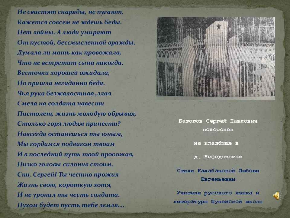 Не свистят снаряды, не пугают. Кажется совсем не ждешь беды. Нет войны. А люди умирают От пустой, бессмысленной вражды. Думала ли мать как провожала, Что не встретит сына никогда. Весточки хорошей ожидала, Но пришла негаданно беда. Чья рука безжалостная,злая Смела на солдата навести Пистолет, жизнь молодую обрывая, Столько горя людям принести ? Навсегда останешься ты юным, Мы гордимся подвигом твоим И в последний путь твой провожая, Низко головы склонив стоим. Спи, Сергей I Ты честно прожил Жизнь свою, короткую хотя, И не уронил ты честь солдата. Пухом будет пусть тебе земля…. Батогов Сергей Павлович похоронен н а кладбище в д. Нефедовская Стихи Калабановой Любови Евгеньевны Учителя русского языка и литературы Шунемской школы