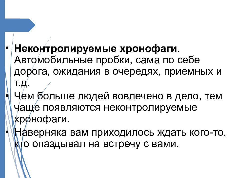 Неконтролируемые хронофаги. Автомобильные пробки, сама по себе дорога, ожидания в очередях, приемных и т.д. Чем больше людей вовлечено в дело, тем чаще появляются неконтролируемые хронофаги. Наверняка вам приходилось ждать кого-то, кто опаздывал на встречу с вами.