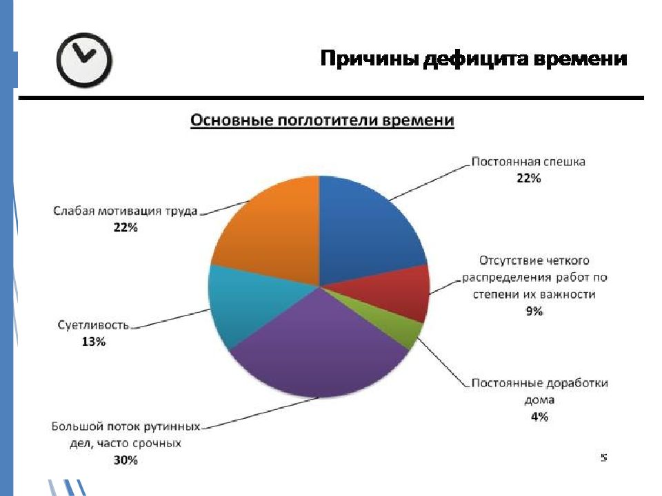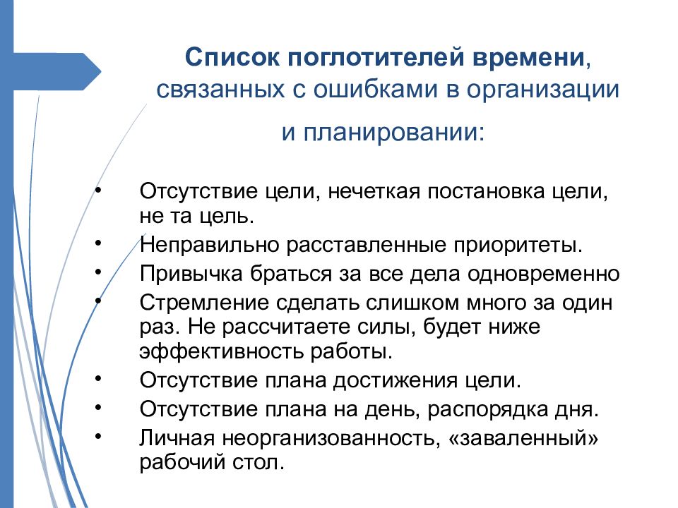 Отсутствие цели, нечеткая постановка цели, не та цель. Неправильно расставленные приоритеты. Привычка браться за все дела одновременно Стремление сделать слишком много за один раз. Не рассчитаете силы, будет ниже эффективность работы. Отсутствие плана достижения цели. Отсутствие плана на день, распорядка дня. Личная неорганизованность, « заваленный » рабочий стол.