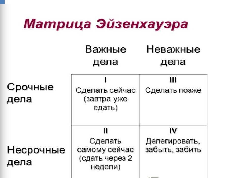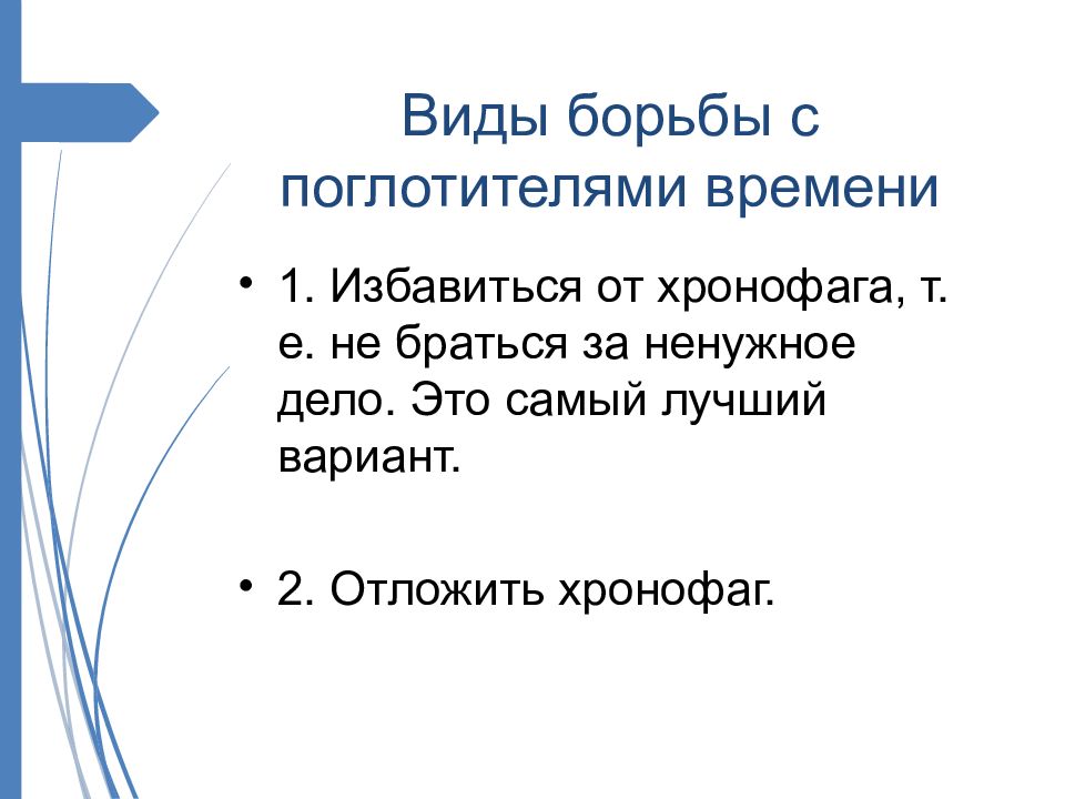 1. Избавиться от хронофага, т. е. не браться за ненужное дело. Это самый лучший вариант. 2. Отложить хронофаг.
