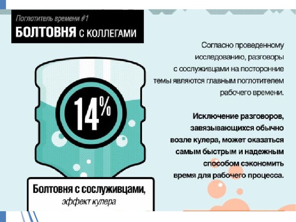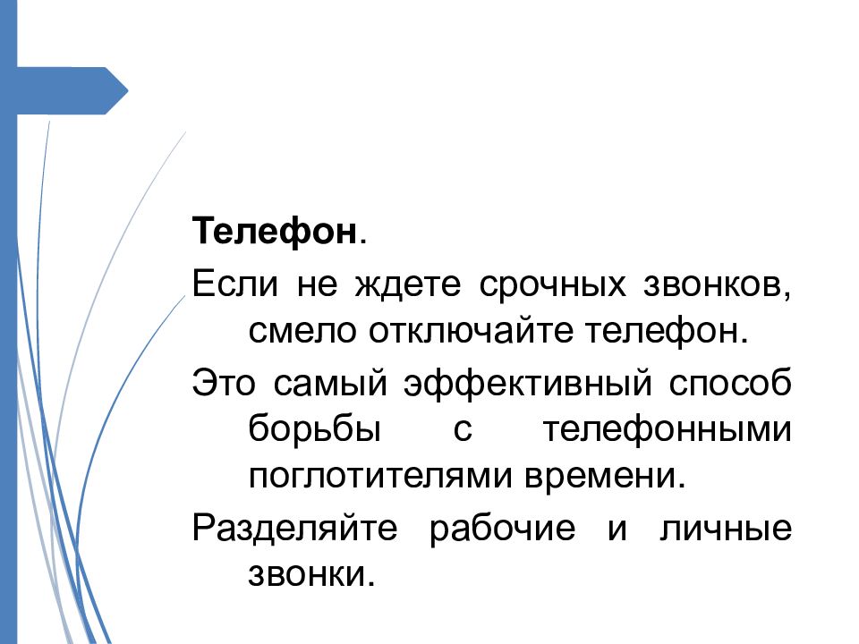 Телефон. Если не ждете срочных звонков, смело отключайте телефон. Это самый эффективный способ борьбы с телефонными поглотителями времени. Разделяйте рабочие и личные звонки.