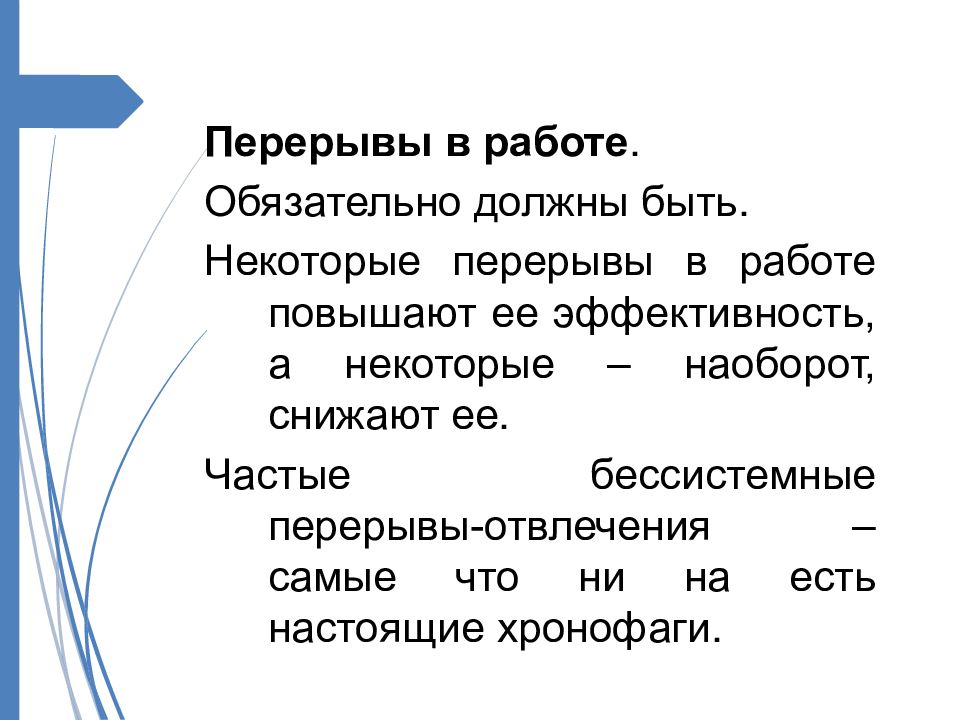 Перерывы в работе. Обязательно должны быть. Некоторые перерывы в работе повышают ее эффективность, а некоторые – наоборот, снижают ее. Частые бессистемные перерывы-отвлечения – самые что ни на есть настоящие хронофаги.