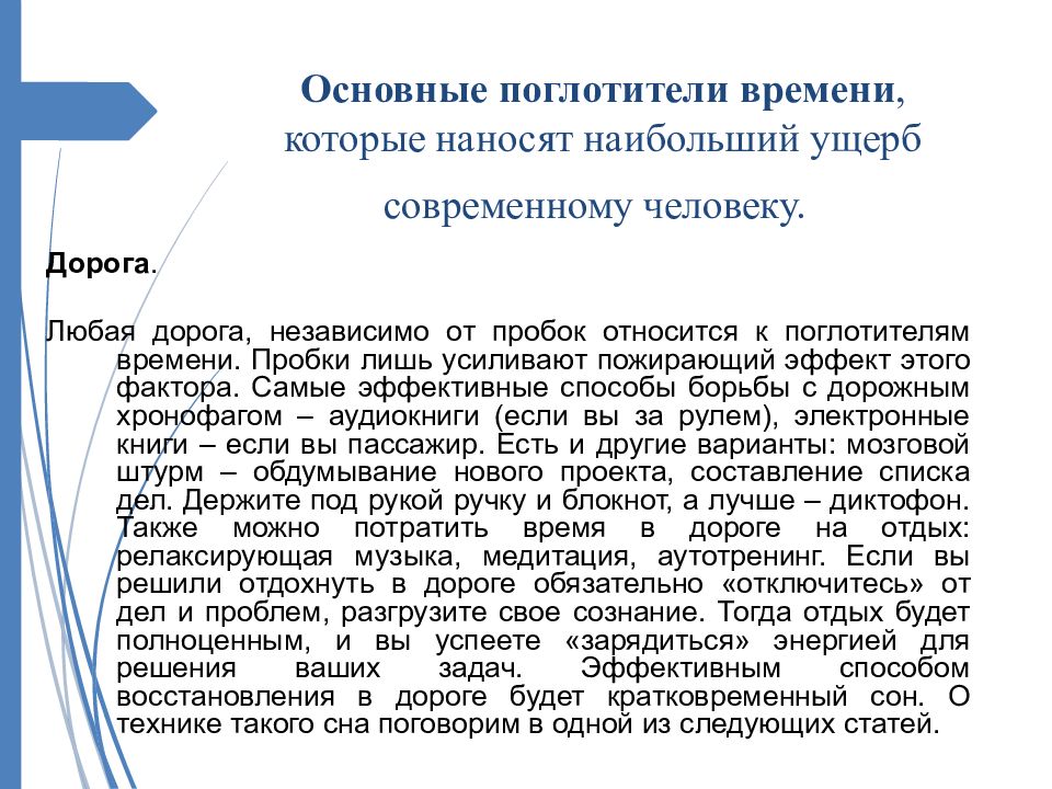 Дорога. Любая дорога, независимо от пробок относится к поглотителям времени. Пробки лишь усиливают пожирающий эффект этого фактора. Самые эффективные способы борьбы с дорожным хронофагом – аудиокниги ( если вы за рулем ), электронные книги – если вы пассажир. Есть и другие варианты : мозговой штурм – обдумывание нового проекта, составление списка дел. Держите под рукой ручку и блокнот, а лучше – диктофон. Также можно потратить время в дороге на отдых : релаксирующая музыка, медитация, аутотренинг. Если вы решили отдохнуть в дороге обязательно « отключитесь » от дел и проблем, разгрузите свое сознание. Тогда отдых будет полноценным, и вы успеете « зарядиться » энергией для решения ваших задач. Эффективным способом восстановления в дороге будет кратковременный сон. О технике такого сна поговорим в одной из следующих статей.