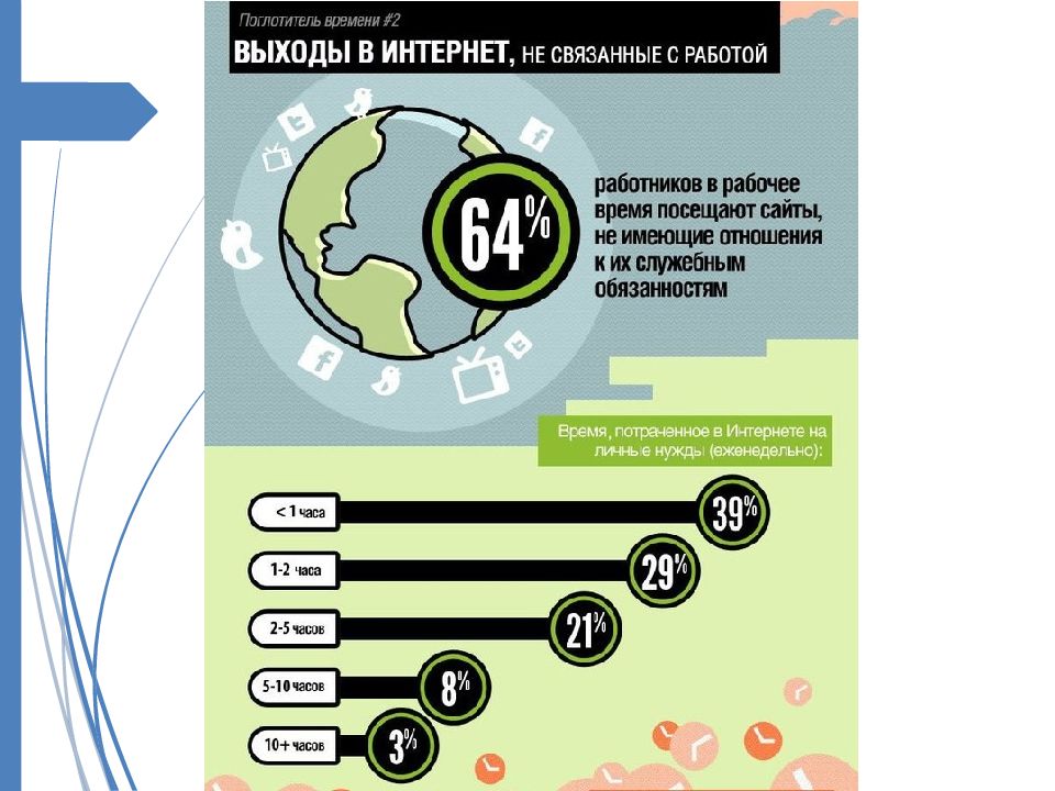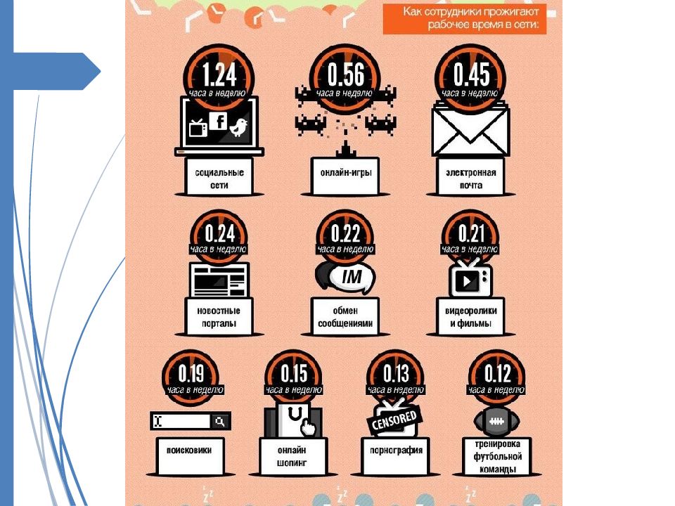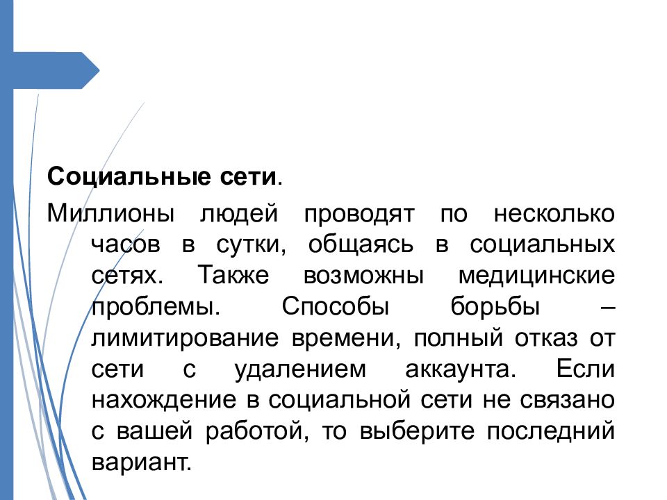 Социальные сети. Миллионы людей проводят по несколько часов в сутки, общаясь в социальных сетях. Также возможны медицинские проблемы. Способы борьбы – лимитирование времени, полный отказ от сети с удалением аккаунта. Если нахождение в социальной сети не связано с вашей работой, то выберите последний вариант.
