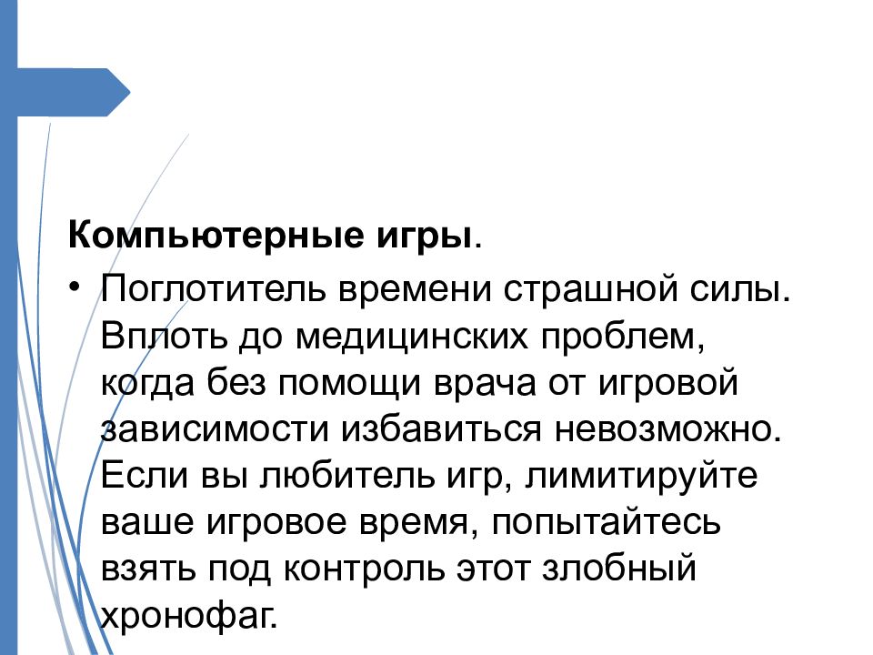 Компьютерные игры. Поглотитель времени страшной силы. Вплоть до медицинских проблем, когда без помощи врача от игровой зависимости избавиться невозможно. Если вы любитель игр, лимитируйте ваше игровое время, попытайтесь взять под контроль этот злобный хронофаг.