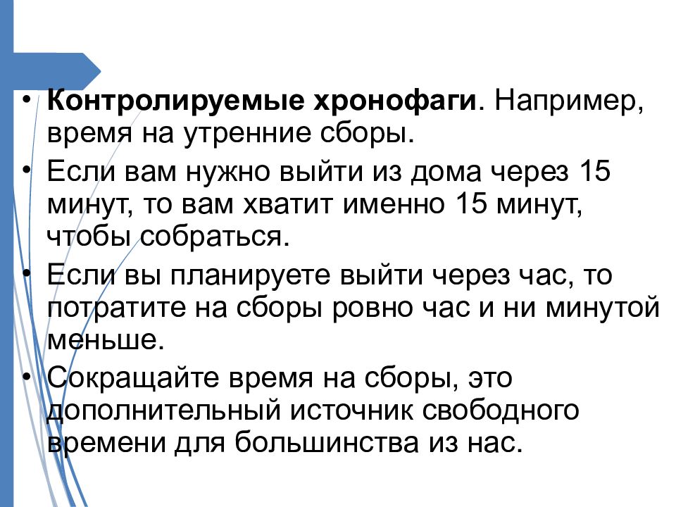 Контролируемые хронофаги. Например, время на утренние сборы. Если вам нужно выйти из дома через 15 минут, то вам хватит именно 15 минут, чтобы собраться. Если вы планируете выйти через час, то потратите на сборы ровно час и ни минутой меньше. Сокращайте время на сборы, это дополнительный источник свободного времени для большинства из нас.