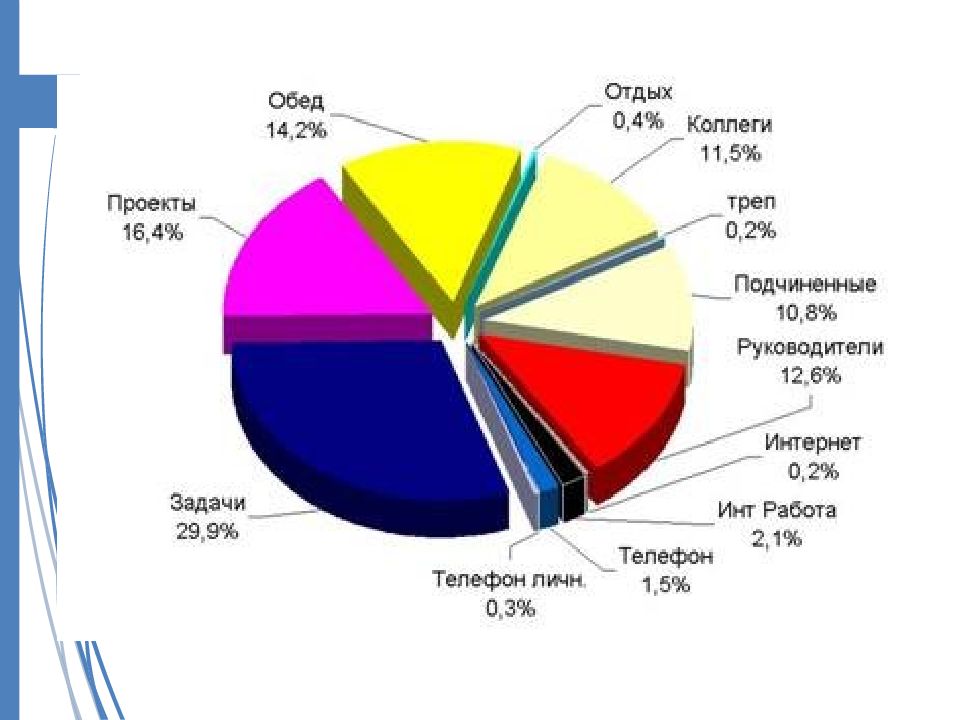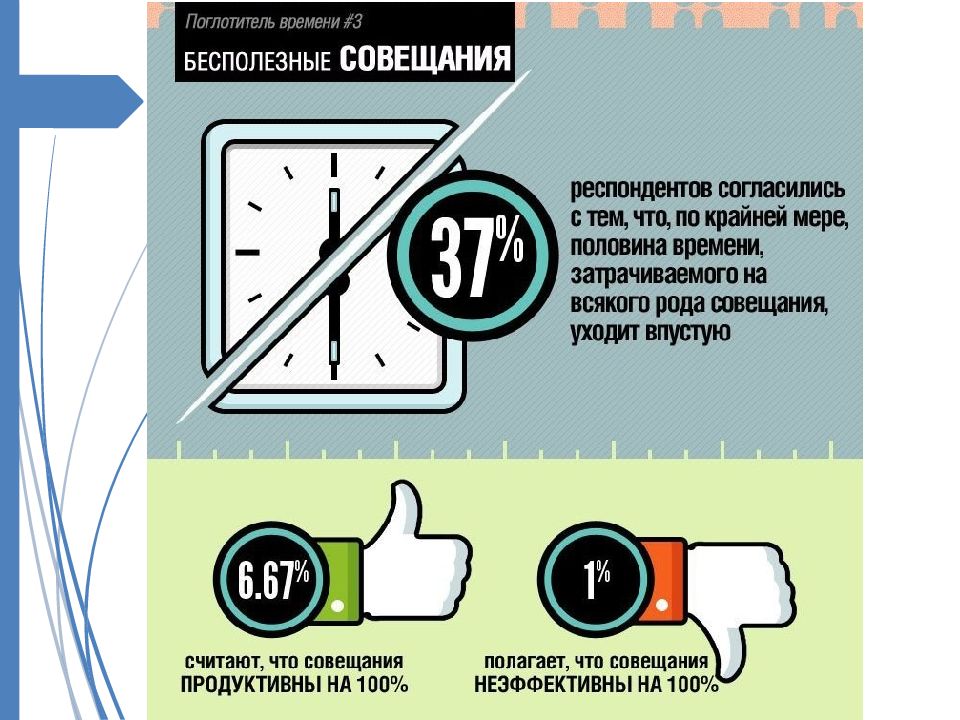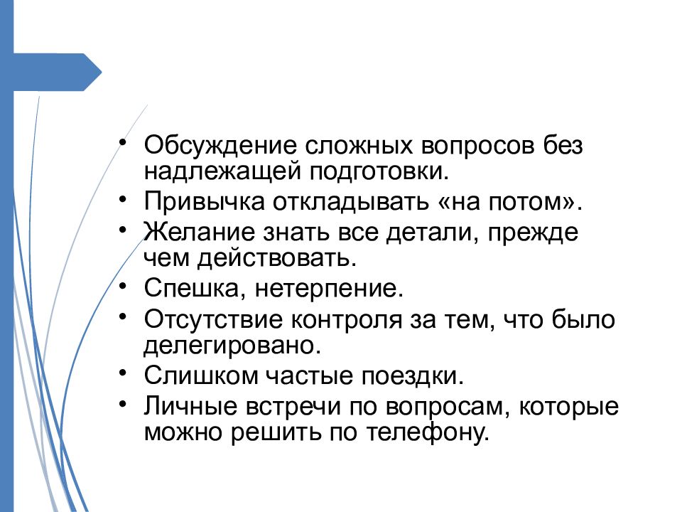 Обсуждение сложных вопросов без надлежащей подготовки. Привычка откладывать « на потом ». Желание знать все детали, прежде чем действовать. Спешка, нетерпение. Отсутствие контроля за тем, что было делегировано. Слишком частые поездки. Личные встречи по вопросам, которые можно решить по телефону.
