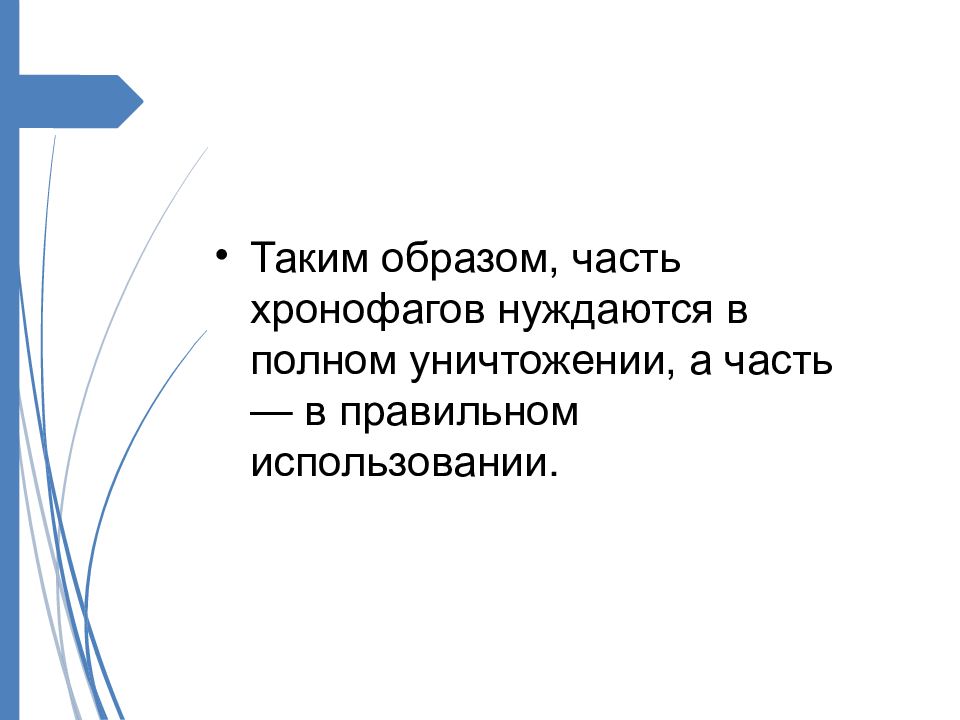 Таким образом, часть хронофагов нуждаются в полном уничтожении, а часть — в правильном использовании.