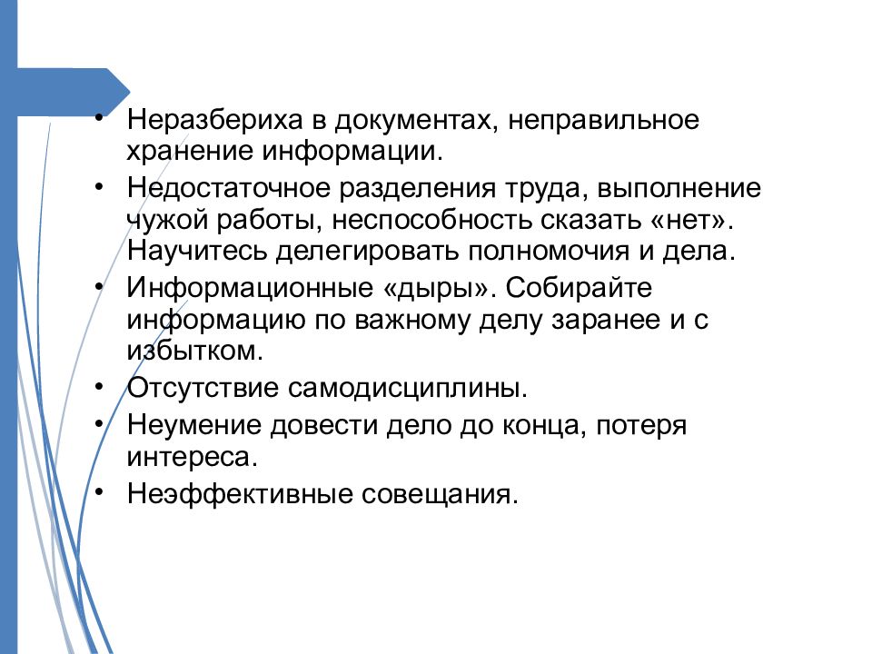 Неразбериха в документах, неправильное хранение информации. Недостаточное разделения труда, выполнение чужой работы, неспособность сказать « нет ». Научитесь делегировать полномочия и дела. Информационные « дыры ». Собирайте информацию по важному делу заранее и с избытком. Отсутствие самодисциплины. Неумение довести дело до конца, потеря интереса. Неэффективные совещания.