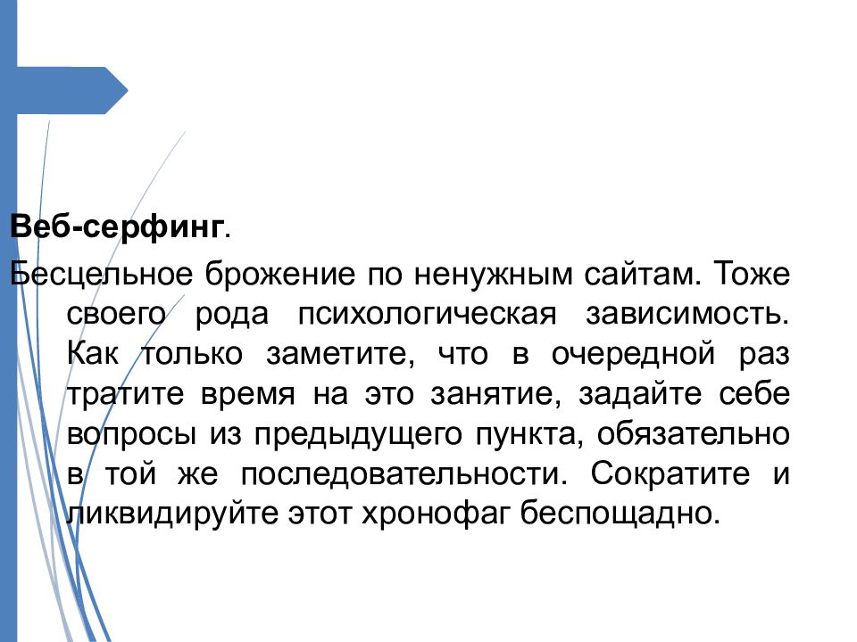 Веб-серфинг. Бесцельное брожение по ненужным сайтам. Тоже своего рода психологическая зависимость. Как только заметите, что в очередной раз тратите время на это занятие, задайте себе вопросы из предыдущего пункта, обязательно в той же последовательности. Сократите и ликвидируйте этот хронофаг беспощадно.