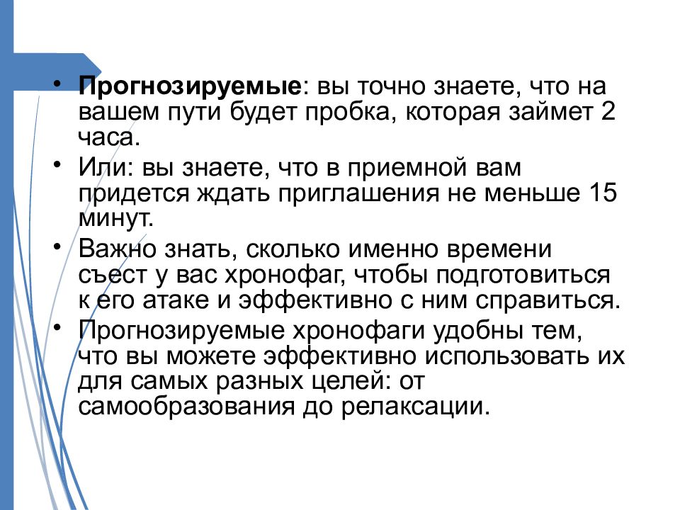 Прогнозируемые : вы точно знаете, что на вашем пути будет пробка, которая займет 2 часа. Или : вы знаете, что в приемной вам придется ждать приглашения не меньше 15 минут. Важно знать, сколько именно времени съест у вас хронофаг, чтобы подготовиться к его атаке и эффективно с ним справиться. Прогнозируемые хронофаги удобны тем, что вы можете эффективно использовать их для самых разных целей : от самообразования до релаксации.