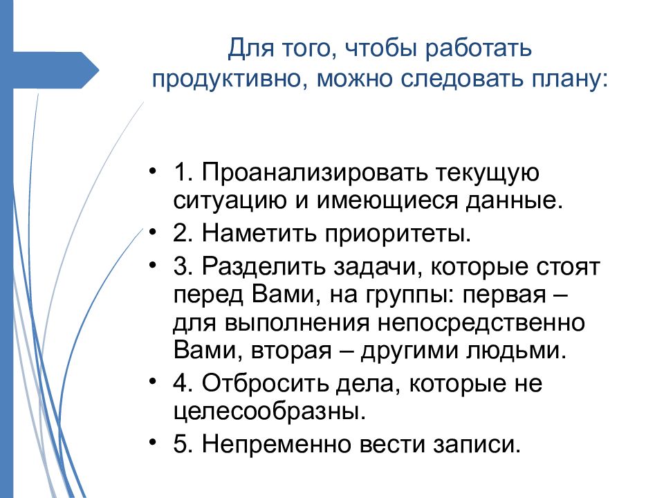 1. Проанализировать текущую ситуацию и имеющиеся данные. 2. Наметить приоритеты. 3. Разделить задачи, которые стоят перед Вами, на группы: первая – для выполнения непосредственно Вами, вторая – другими людьми. 4. Отбросить дела, которые не целесообразны. 5. Непременно вести записи.