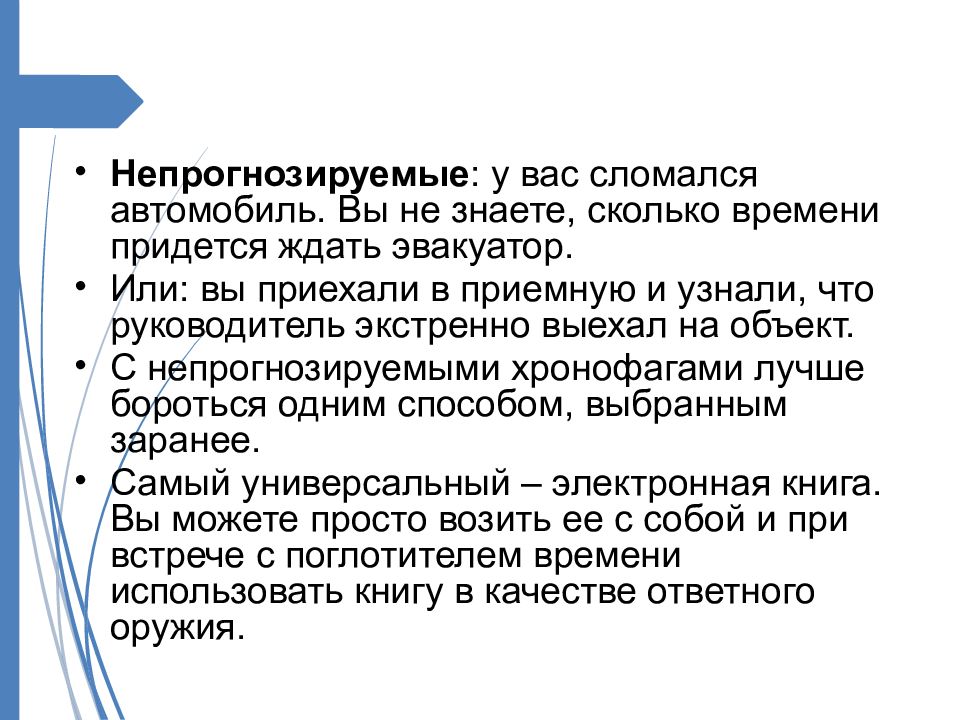 Непрогнозируемые : у вас сломался автомобиль. Вы не знаете, сколько времени придется ждать эвакуатор. Или : вы приехали в приемную и узнали, что руководитель экстренно выехал на объект. С непрогнозируемыми хронофагами лучше бороться одним способом, выбранным заранее. Самый универсальный – электронная книга. Вы можете просто возить ее с собой и при встрече с поглотителем времени использовать книгу в качестве ответного оружия.