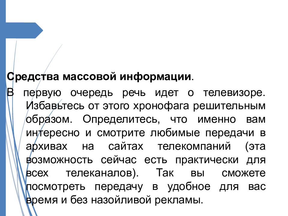 Средства массовой информации. В первую очередь речь идет о телевизоре. Избавьтесь от этого хронофага решительным образом. Определитесь, что именно вам интересно и смотрите любимые передачи в архивах на сайтах телекомпаний ( эта возможность сейчас есть практически для всех телеканалов ). Так вы сможете посмотреть передачу в удобное для вас время и без назойливой рекламы.
