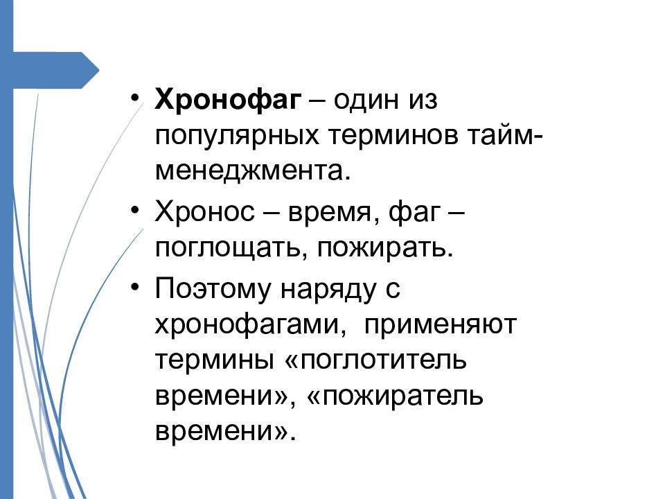 Хронофаг – один из популярных терминов тайм-менеджмента. Хронос – время, фаг – поглощать, пожирать. Поэтому наряду с хронофагами, применяют термины « поглотитель времени », « пожиратель времени ».