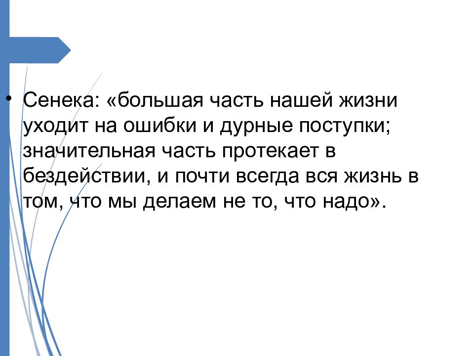 Сенека: «большая часть нашей жизни уходит на ошибки и дурные поступки; значительная часть протекает в бездействии, и почти всегда вся жизнь в том, что мы делаем не то, что надо».