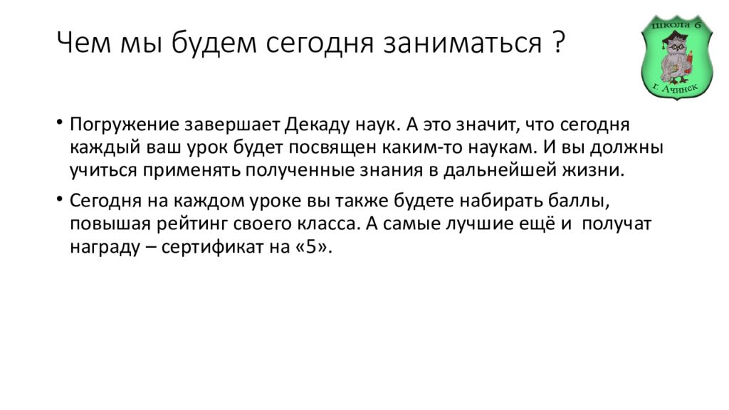 Погружение завершает Декаду наук. А это значит, что сегодня каждый ваш урок будет посвящен каким-то наукам. И вы должны учиться применять полученные знания в дальнейшей жизни. Сегодня на каждом уроке вы также будете набирать баллы, повышая рейтинг своего класса. А самые лучшие ещё и получат награду – сертификат на «5».