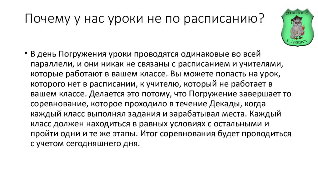 В день Погружения уроки проводятся одинаковые во всей параллели, и они никак не связаны с расписанием и учителями, которые работают в вашем классе. Вы можете попасть на урок, которого нет в расписании, к учителю, который не работает в вашем классе. Делается это потому, что Погружение завершает то соревнование, которое проходило в течение Декады, когда каждый класс выполнял задания и зарабатывал места. Каждый класс должен находиться в равных условиях с остальными и пройти одни и те же этапы. Итог соревнования будет проводиться с учетом сегодняшнего дня.