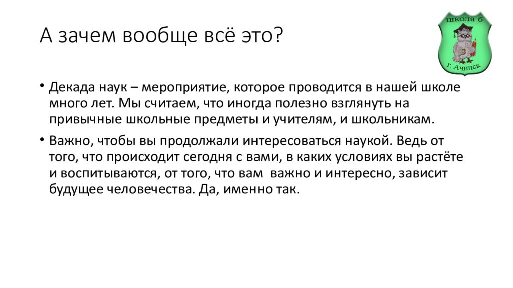 Декада наук – мероприятие, которое проводится в нашей школе много лет. Мы считаем, что иногда полезно взглянуть на привычные школьные предметы и учителям, и школьникам. Важно, чтобы вы продолжали интересоваться наукой. Ведь от того, что происходит сегодня с вами, в каких условиях вы растёте и воспитываются, от того, что вам важно и интересно, зависит будущее человечества. Да, именно так.