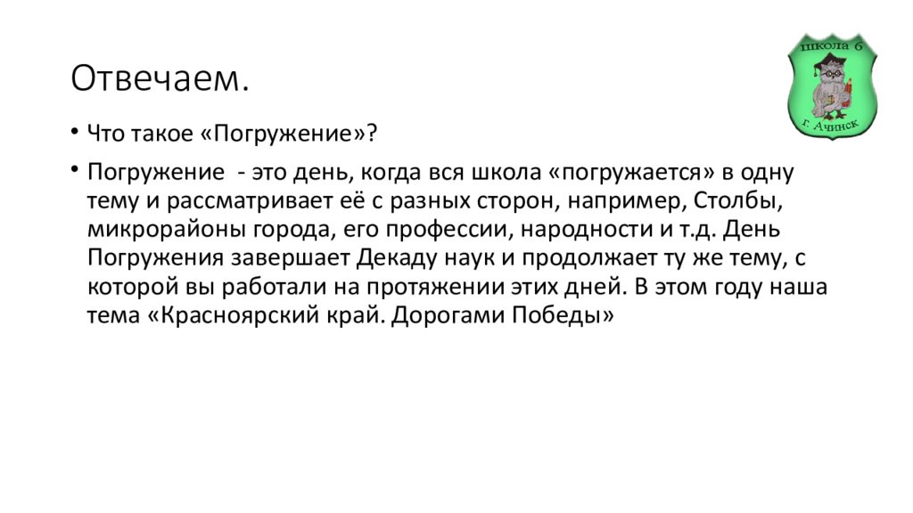 Что такое «Погружение»? Погружение - это день, когда вся школа «погружается» в одну тему и рассматривает её с разных сторон, например, Столбы, микрорайоны города, его профессии, народности и т.д. День Погружения завершает Декаду наук и продолжает ту же тему, с которой вы работали на протяжении этих дней. В этом году наша тема «Красноярский край. Дорогами Победы»