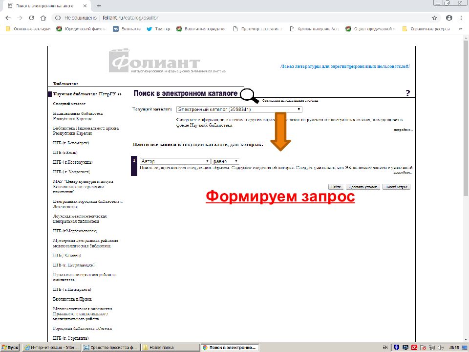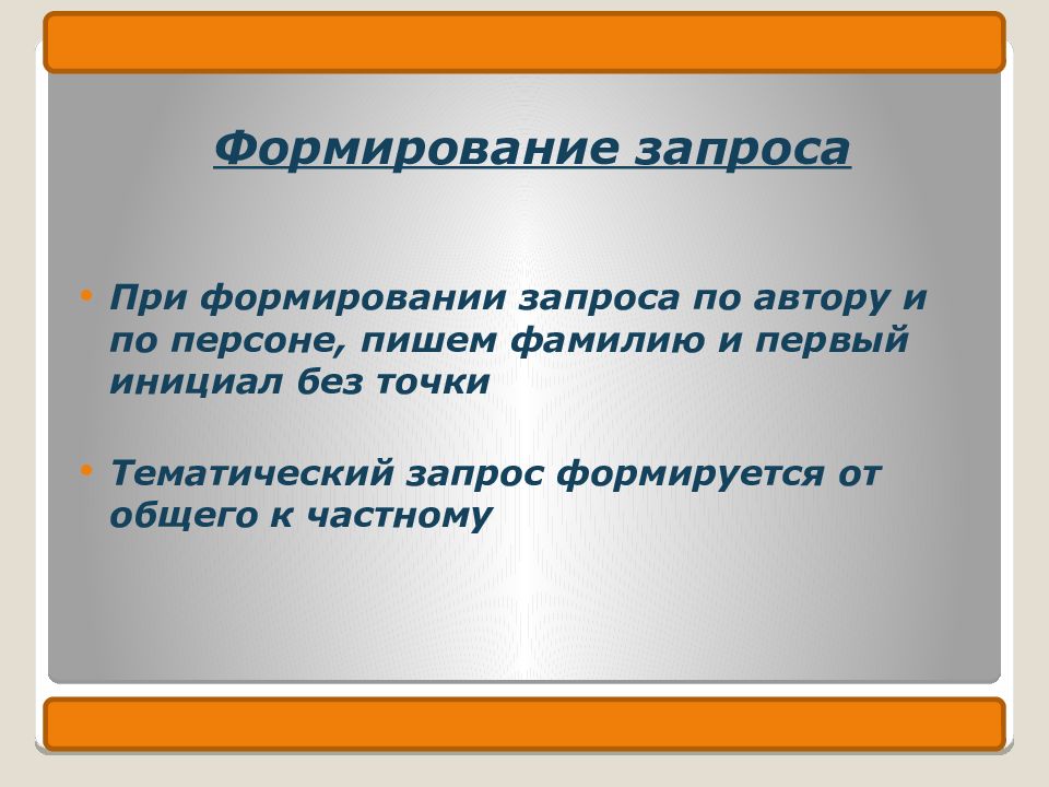 Формирование запроса При формировании запроса по автору и по персоне, пишем фамилию и первый инициал без точки Тематический запрос формируется от общего к частному