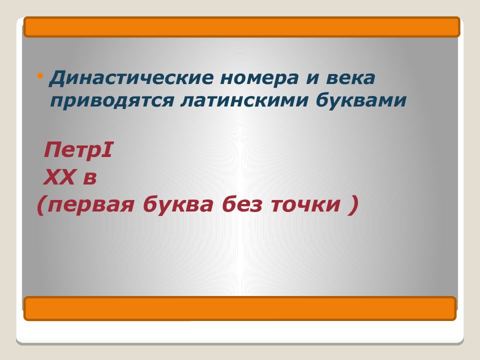 Династические номера и века приводятся латинскими буквами Петр I ХХ в (первая буква без точки )