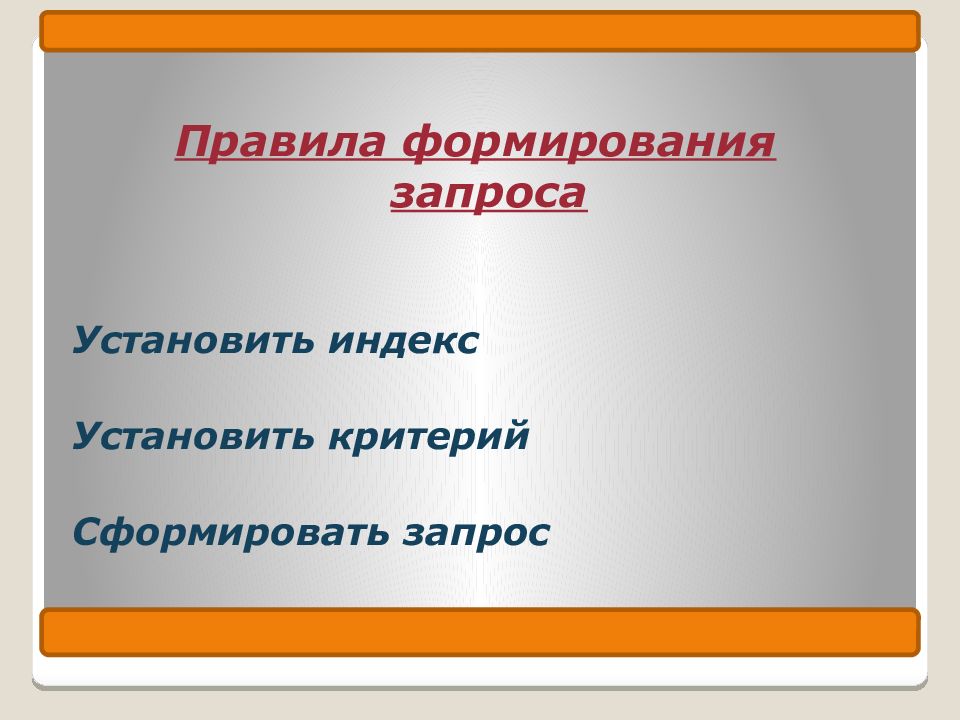 Правила формирования запроса Установить индекс Установить критерий Сформировать запрос