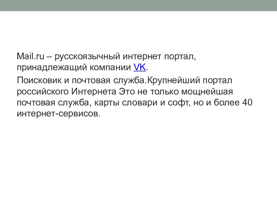 Mail.ru – русскоязычный интернет портал, принадлежащий компании VK. Поисковик и почтовая служба.Крупнейший портал российского Интернета Это не только мощнейшая почтовая служба, карты словари и софт, но и более 40 интернет-сервисов.