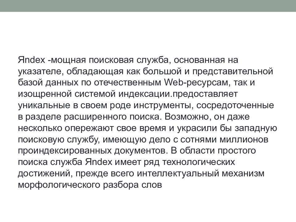 Я ndex - мощная поисковая служба, основанная на указателе, обладающая как большой и представительной базой данных по отечественным Web -ресурсам, так и изощренной системой индексации.предоставляет уникальные в своем роде инструменты, сосредоточенные в разделе расширенного поиска. Возможно, он даже несколько опережают свое время и украсили бы западную поисковую службу, имеющую дело с сотнями миллионов проиндексированных документов. В области простого поиска служба Яndех имеет ряд технологических достижений, прежде всего интеллектуальный механизм морфологического разбора слов